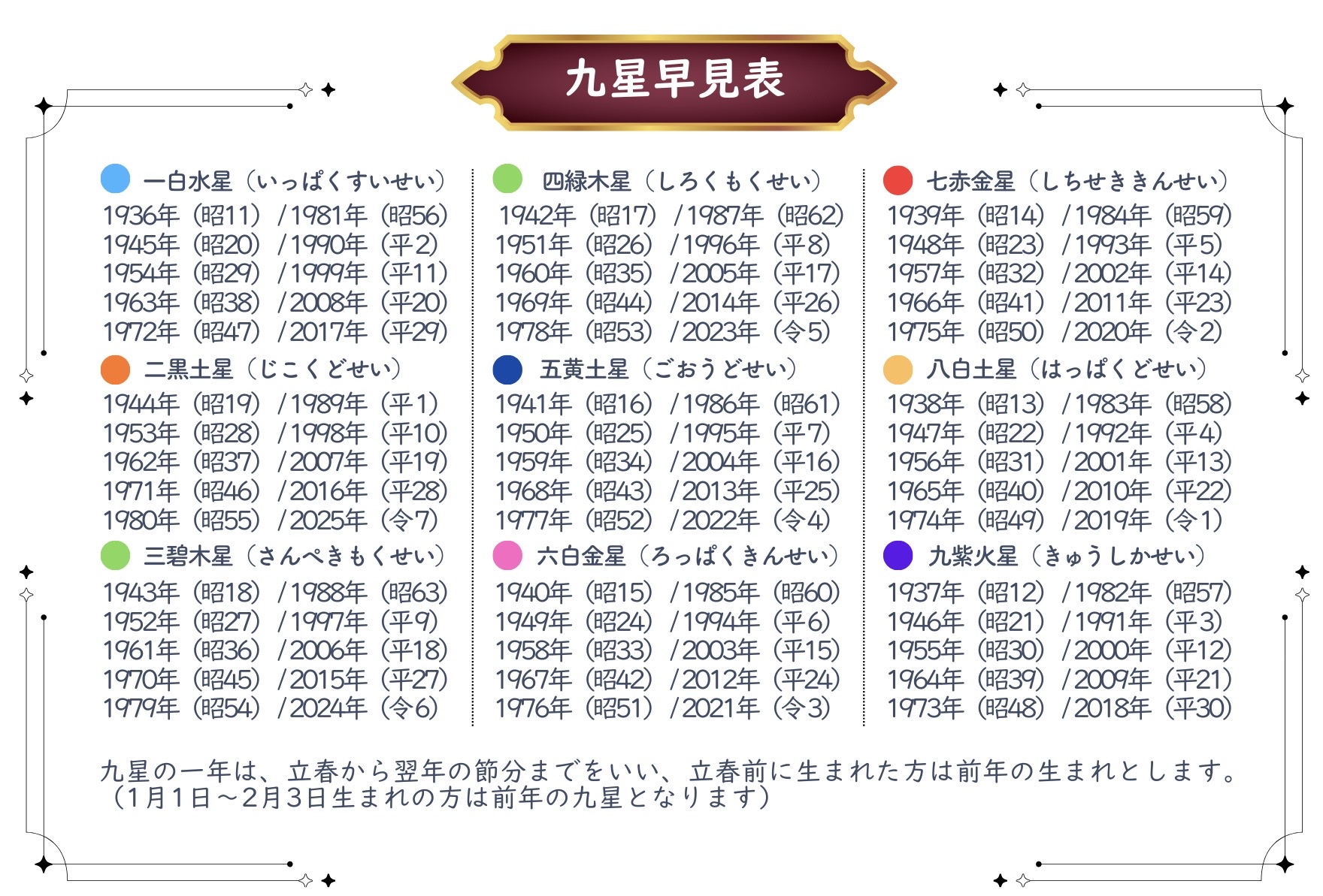 ご自身の運命星(九星)が分からない方は、文末に掲載している一覧表をご参照のうえ、お読みください。
